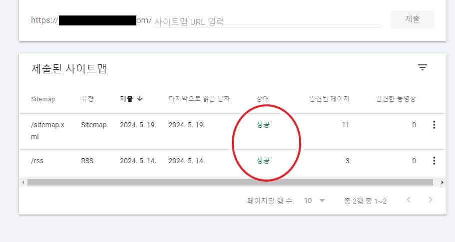 자동으로 주소는 기재되어있으니 sitemap.xml 넣고 제출. rss 넣고 제출. 두번 반복한다.