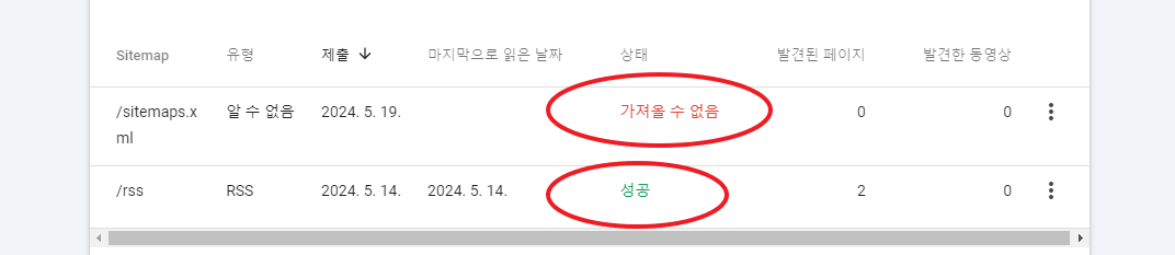 구글서치콘솔 티스토리 등록 sitemap.xml rss오류 가져올 수 없음 해결방법
