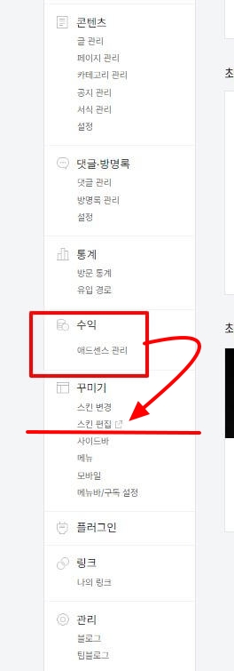 에드센스와 연동을 한 상태이니 이제 1번에서 확인했던 애드센스 연동한 블로그 관리탭 관리창 수익 - 애드센스 관리 들어옵니다.